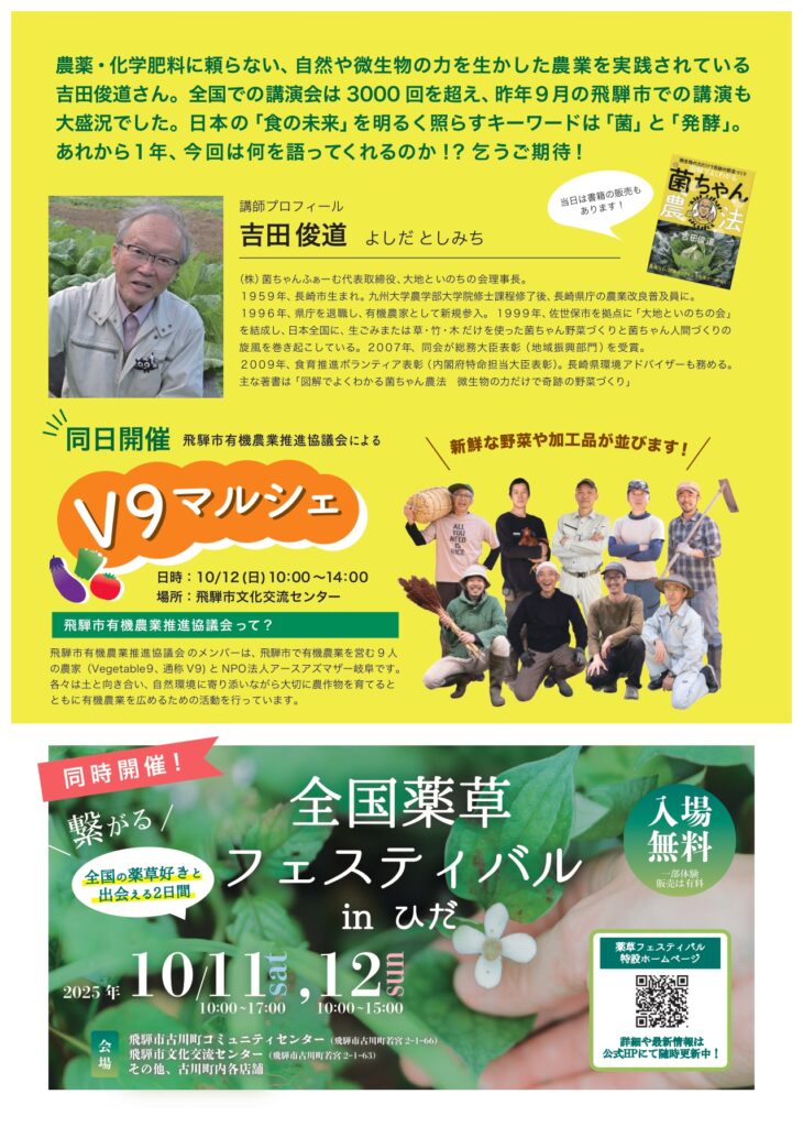 昨年の講演会は大好評だった吉田俊道さんが再び飛騨市にやってきます!農薬・化学肥料に頼らない、自然や微生物の力を生かした農業を実践されており、全国での講演会は3000回を超えます。「菌」と「発酵」をテーマに身体と心の健康について考え、「食」の大切さを学ぶことができる貴重な機会です。食べることに興味がある方、野菜づくりをされている方など、世代を問わず楽しめる講演会となります。ぜひご来場ください!