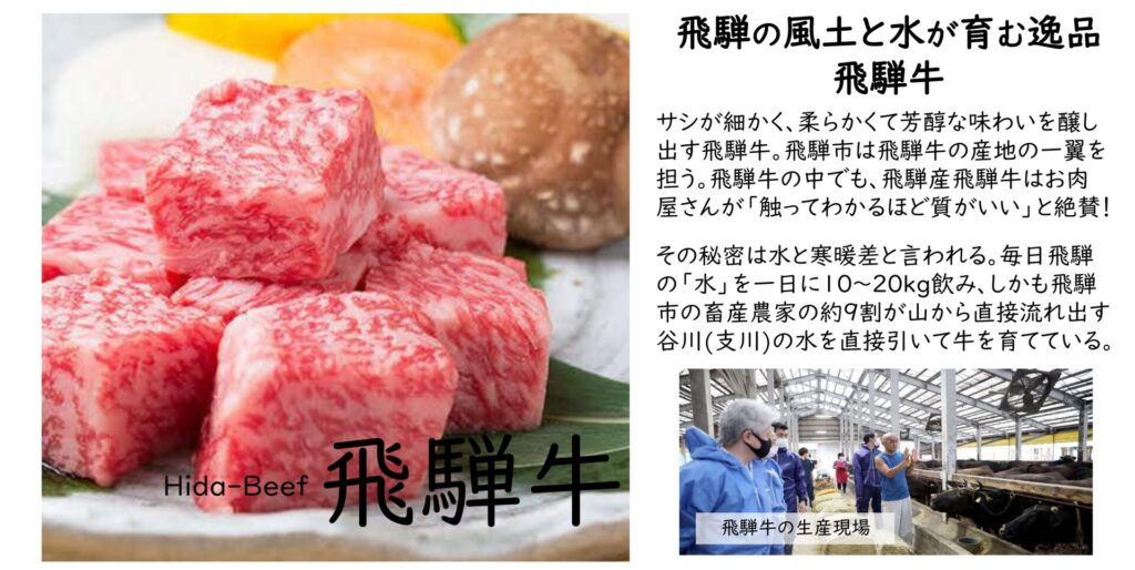 飛騨市は、岐阜県の最北端に位置し、総面積の約93%を森林が占め、神通川水系の宮川、高原川とその支流に沿って集落と耕地が点在する自然豊かなまちです。こうした環境のもとで育つ飛騨市自慢の食材は、標高 200m~1,000m に及ぶ高低差と冷涼な気候を生かしたトマト・ほうれんそうなどの高冷地野菜をはじめ、リンゴ・モモなどの果樹類や、米・食味分析鑑定コンクールで輝かしい成績を誇る飛騨米、更には全国的にも有名な飛騨牛や日本一の暴れ鮎として知られる清流みやがわ鮎、利き鮎会で全国1位になった高原川の鮎など、どれも味わい深く、食材そのものの味が濃いのが特徴です。