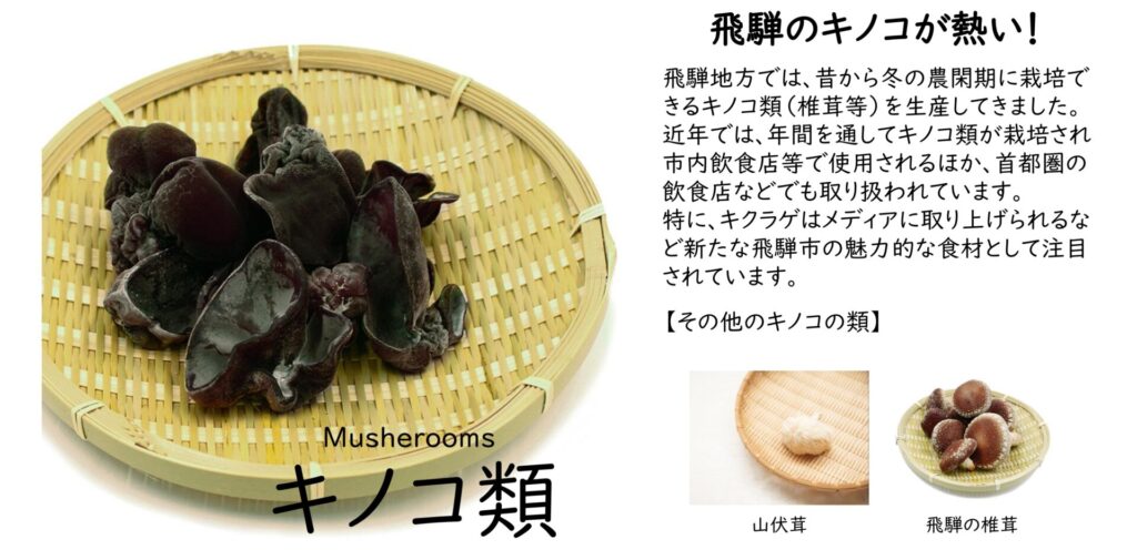 また、春はたらの芽やコシアブラ、竹の子(姫竹)などで山全体が天然食材の宝庫に変わり、秋には香茸や舞茸など香りと食感が楽しめるほか、古くから私たちの生活に密接に関わってきた伝承作物など、季節を感じながら自然の幸を味わうことができるのも、飛騨市の大きな魅力のひとつです。