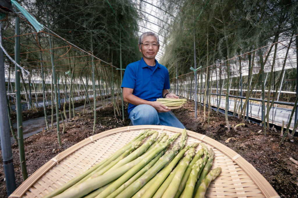 人のあたたかい飛騨市で、日々農業の喜びを感じているという岩塚さん。大きく茂ったアスパラガス畑で話を聞いた。